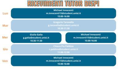 - Giulia GALIA (g.galia@student.unisi.it): Every Wednesday 10:30 AM - 11:30 AM
