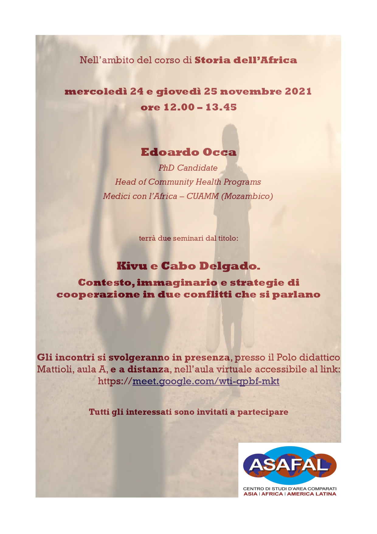 Nell’ambito del corso di Storia dell’Africa, mercoledì 24 e giovedì 25 novembre 2021 ore 12.00 - 13.45: