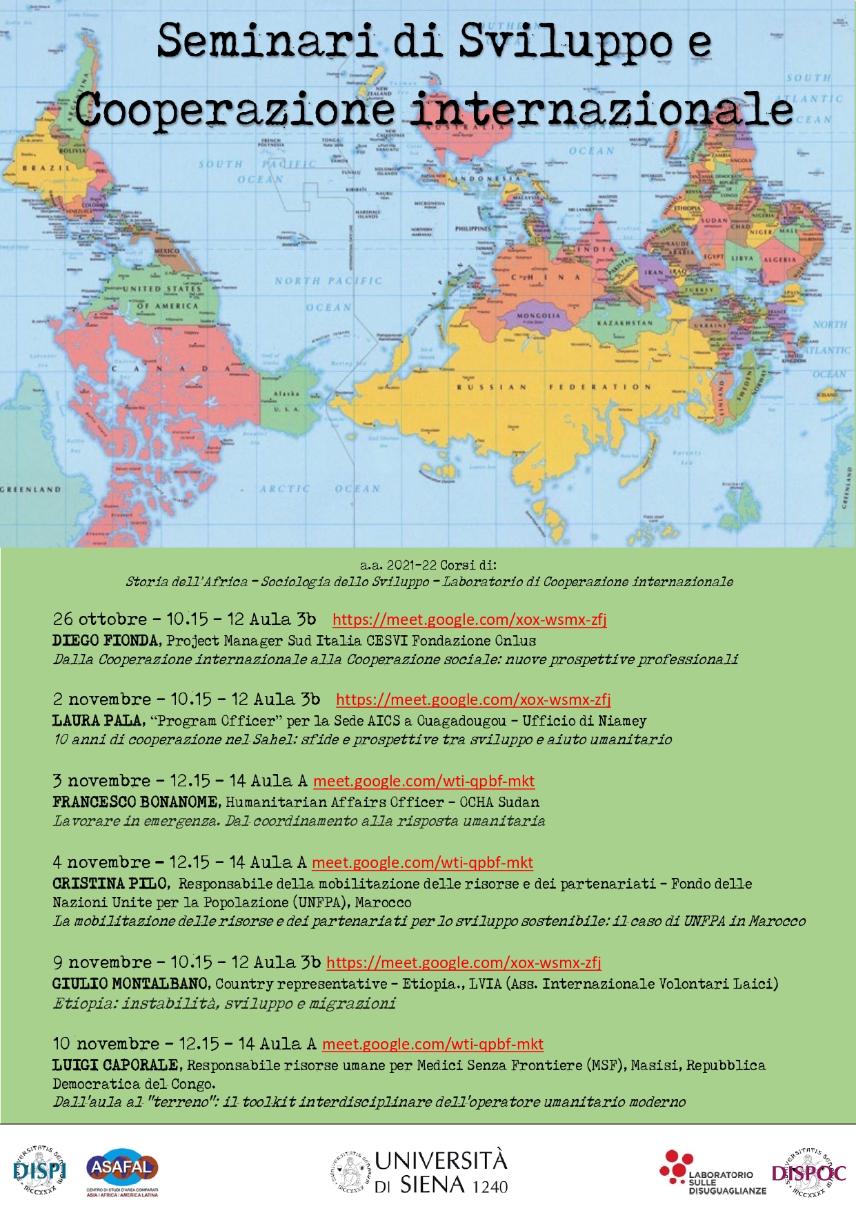 La lezione di Storia dell'Africa di martedì 26 ottobre (14.30-16.15) è annullata e sostituita dal seminario di sviluppo e cooperazione che si svolge lo stesso giorno in orario 10.15-12.00 (il seminario in presenza si svolge nell'aula di lezione del prof. Lorenzo Nasi; per la partecipazione a distanza seguire questo link: https://meet.google.com/xox-wsmx-zfj);