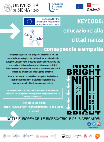 Il progetto KeyCode è un progetto Erasmus + KA2 di partenariato strategico fra università e scuole a livello europeo. Obiettivo del progetto quello di contribuire alla promozione dei valori democratici europei e diritti fondamentali attraverso il ricorso a strumenti educativi basati su empatia ed intelligenza emotiva.