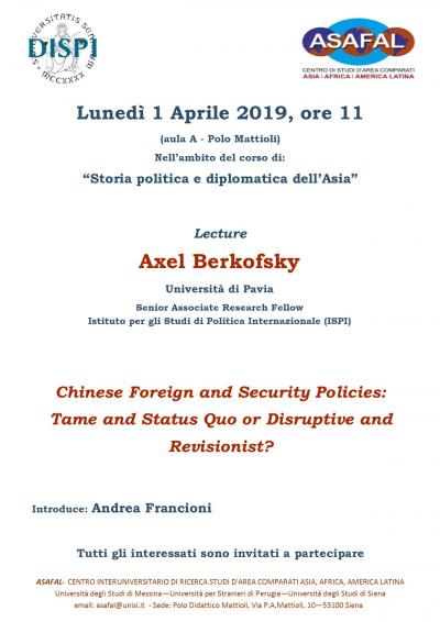 Nell’ambito del corso di: “Storia politica e diplomatica dell’Asia" il prof. Axel Berkofsky, Senior Associate Research Fellow Istituto per gli Studi di Politica Internazionale (ISPI), dell'Università di Pavia Senior Associate Research