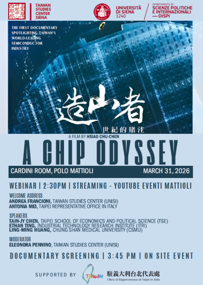 Il 31 marzo 2026 il Dipartimento di Scienze Politiche e Internazionali (Polo Mattioli, Aula Cardini, ore 14.30) ospita la proiezione pubblica del documentario "A Chip Odyssey" (2025) di Hsiao Chu-Chen, che ricostruisce la storia dell'industria dei semiconduttori a Taiwan, attualmente il paese responsabile del 25% della produzione mondiale di microchip e del 90% di quella dei chip logici più avanzati.
