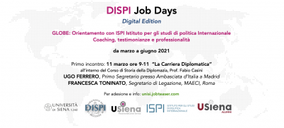 Nell’ambito del DISPI Job Days, all’interno del Corso di Storia della diplomazia del Prof. Casini, nella stanza virtuale delle lezioni del Corso (meet.google.com/uwd-cqqi-dsz) giovedì 11 marzo alle ore 9.00 sarà discussa “La carriera diplomatica”.