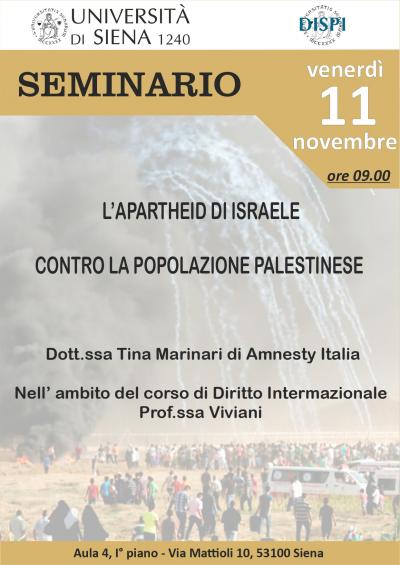 Nell’ambito del corso di Diritto internazionale (Pof.ssa Alessandra Viviani) la Dott.ssa Tina Marinari di Amnesty Italia, terrà il Seminario !L’APARTHEID DI ISRAELE CONTRO LA POPOLAZIONE PALESTINESE”