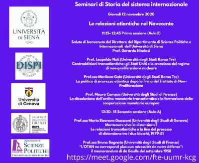 Giovedì 12 novembre dalle ore 11:15 alle ore 12:45 e dalle ore 13:30 alle ore 15:00 si terranno i seminari di Storia del sistema internazionale con ad oggetto “Le relazioni atlantiche nel Novecento”.