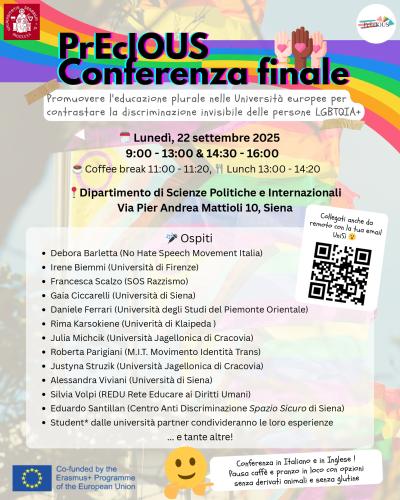 Lunedì 22 settembre dalle 9:00 alle 16:00 presso la Sala Conferenze del Polo Mattioli in via P. A. Mattioli 10, Siena si terrà la Conferenza finale del progetto PrEcIOUS - Promuovere l'educazione plurale nelle università europee per contrastare la discriminazione invisibile delle persone LGBTQIA+.