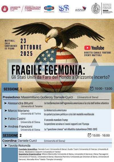 Giovedì 23 ottobre 2025, presso il Dipartimento di Scienze Politiche e Internazionali dell’Università di Siena, si terrà una giornata di studi dedicata alla democrazia negli Stati Uniti.
