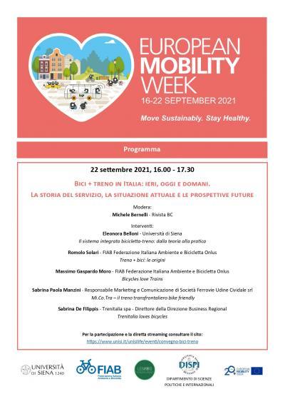 Mercoledì 22 settembre il Dispi ha ospitato in modalità online il convegno Bici + treno in Italia: ieri, oggi e domani. La storia del servizio, la situazione attuale e le prospettive future, evento conclusivo della European Mobility Week 2021. Organizzato dal Laboratorio per l’Educazione alla Mobilità Sostenibile (LEMOS) e dalla Federazione Italiana Ambiente e Bicicletta Onlus (FIAB), l’incontro è stato l’occasione per un confronto su un tema – quello del trasporto integrato bicicletta-mezzi pubblici – centrale nel ripensamento della mobilità del futuro. Hanno preso parte alla discussione, moderati da Michele Bernelli, direttore della Rivista BC: Eleonora Belloni, dell’Università di Siena; Romolo Solari e Massimo Gaspardo Moro di FIAB; Sabrina Paola Manzini di Società Ferrovie Udine Cividale srl Mi.Co.Tra e Sabrina De Filippis, Direttore della Direzione Business Regionale di Trenitalia.