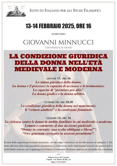 Il tema della capacità processuale femminile, che da tempo costituisce un fervido terreno di indagine, è illustrato alla luce delle fonti giuridiche canonistiche e civilistiche e delle elaborazioni teoriche dei giuristi dell’età del diritto comune, cui si aggiungerà la lettura e il commento di alcune sentenze di età medievale e moderna.