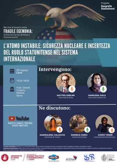 Lunedì 30 marzo, dalle 16:30 alle 18:00, presso l’Aula Camaiti (III piano, Mattioli) a Siena, si terrà l’incontro dal titolo “L’atomo instabile: sicurezza nucleare e incertezza del ruolo statunitense nel sistema internazionale”, nell’ambito del ciclo “Fragile egemonia”, dedicato alle trasformazioni del ruolo degli Stati Uniti nello scenario globale.
