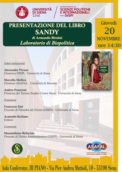 Giovedì 20 novembre 2025 alle ore 14:30, presso l’Aula Conferenze al terzo piano di Via Pier Andrea Mattioli 10 a Siena, si terrà la presentazione del libro "Sandy" di Armando Birnini, organizzata dal Laboratorio di Biopolitica e dal Centro di Studi d’Area Comparati Asia Africa America Latina (ASAFAL) dell’Università di Siena.