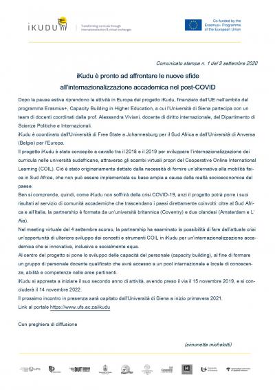 Comunicato stampa n. 1 del 9 settembre 2020