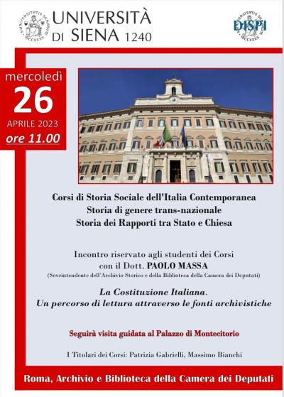 Gli studenti dei corsi di Storia sociale dell'Italia contemporanea, Storia di genere transnazionale e Storia dei rapporti fra Stato e Chiesa, incontreranno il Sovraintendente all'Archivio storico e della Biblioteca della Camera dei Deputati, Paolo Massa.